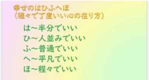 部下の接し方、後輩の接し方、子供の接し方、「幸せのはひふへほ」を現場で取り入れてストレスを緩めて体を労ることも時には大切です。