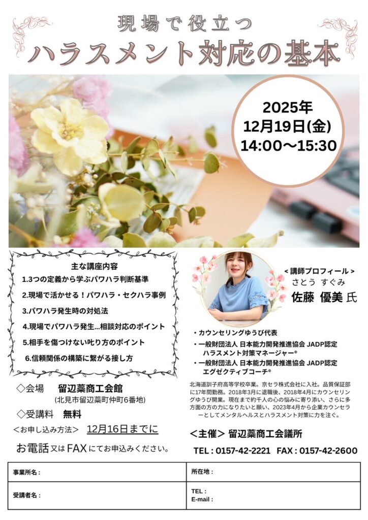 『【留辺蘂商工会議所 主催】現場で役立つハラスメント対策の基本』